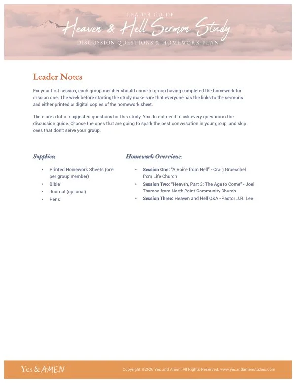 Heaven & Hell is a 3-week sermon study. Each week you will listen to a sermon from a different church about the what we know about Heaven and Hell. Hearing from three different churches allows your group to gain a unique perspective on a difficult topic. If your group has ever had questions about angels, what does heaven look like, what do we know about hell, or will I see my favorite pet again; this is an excellent survey study into the topic.
