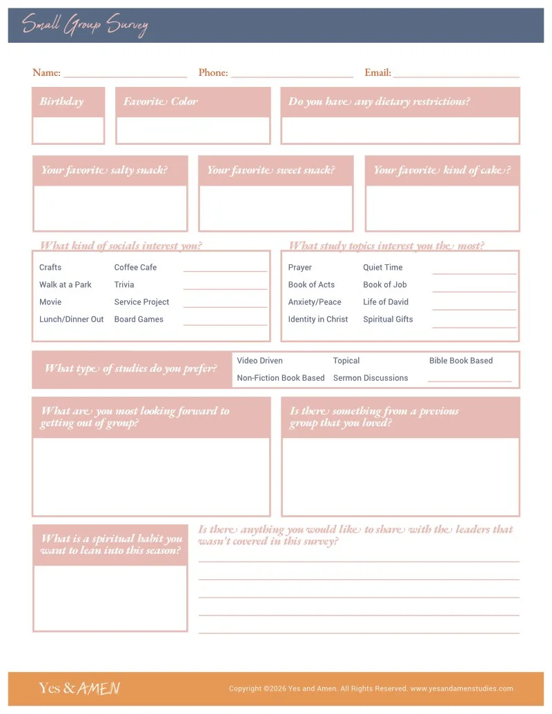 Each small group or bible study is unique, because it is made up of individuals. Handing out a survey to your new small group is a great way to get to know each person, while also gaining information to inform your decisions as a leader. Below you will find suggestions and resources to build a survey that can anchor your group for the future.